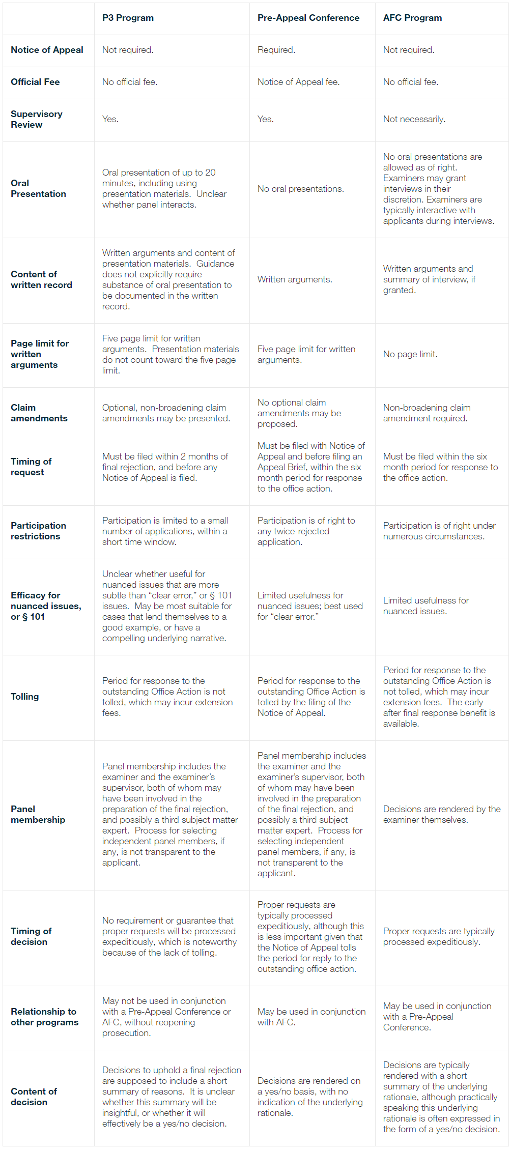Click here to view a full comparison of the P3, Pre-Appeal Conference, and AFC programs.